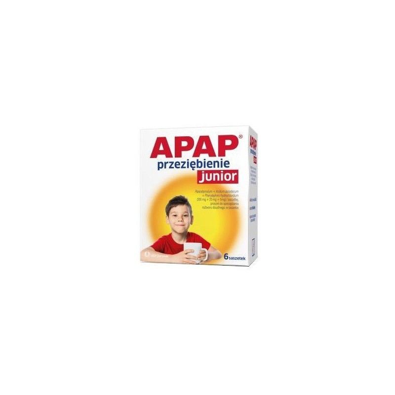 Apap przeziębienie junior wskazany jest dla dzieci powyżej 6 roku życia oraz dla dorosłych, w leczeniu objawów przeziębienia i grypy (ból głowy, gorączka. dreszcze, bóle mięśniowo-stawowe, ból gardła, nieżyt błony śluzowej nosa - katar oraz niedrożność przewodów nosowych i zatok).