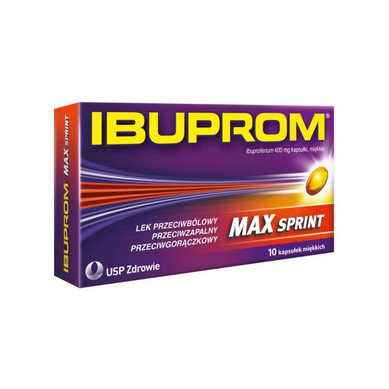 Ibuprom Max Sprint to lek przeciwzapalny, przeciwbólowy i przeciwgorączkowy w formie kapsułek miękkich, zawierających ibuprofen z grupy niesteroidowych leków przeciwzapalnych (NLPZ). Ibuprom max sprint stosuje się w bólach różnego pochodzenia o nasileniu słabym do umiarkowanego: bóle głowy (m.in. ból napięciowy), migrena z aurą lub bez aury (objawy takie jak: ból głowy, nudności, nadwrażliwość na światło i dźwięk), bóle zębów, nerwobóle, bóle mięśniowe, bóle kostne i stawowe. Lek można podawać również w bólu menstruacyjnym oraz gorączce, towarzyszącej np. przeziębieniu czy grypie. Lek jest przeznaczony dla osób dorosłych oraz młodzieży w wieku powyżej 12 lat