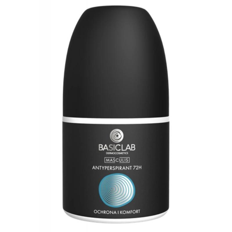 BasicLab Men Antyperspirant 72h: długa ochrona przed poceniem i przykrym zapachem. Trehaloza nawilża i łagodzi podrażnienia. Dla każdej skóry, bez plam.