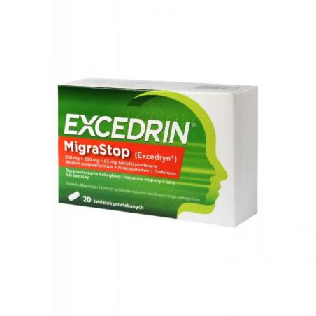 Excedrin MigraStop to lek przeciwbólowy zawierający kwas acetylosalicylowy, paracetamol i kofeinę, przeznaczony do doraźnego leczenia bólu głowy oraz napadów migreny (z aurą lub bez). Dzięki synergicznemu działaniu składników, skutecznie zmniejsza ból, gorączkę i działa przeciwzapalnie, wspierając komfort pacjenta.