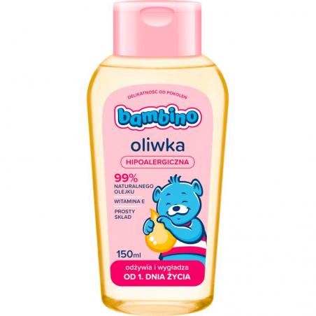 Oliwka Bambino to delikatna, hipoalergiczna formuła składająca się w 99% ze składników pochodzenia naturalnego, przeznaczona do pielęgnacji wrażliwej skóry dzieci i niemowląt od 1. dnia życia. Oliwka głęboko nawilża, natłuszcza i koi podrażnienia dzięki witaminie E, a także idealnie nadaje się do masażu