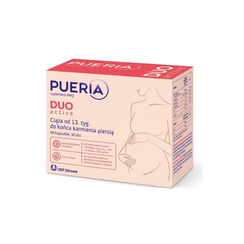 Pueria Duo Active to suplement diety w postaci dwóch rodzajów kapsułek, przeznaczony dla kobiet od 13. tygodnia ciąży aż do końca karmienia piersią. Zawarte w nim składniki wspierają prawidłowy rozwój płodu i zdrowie matki.