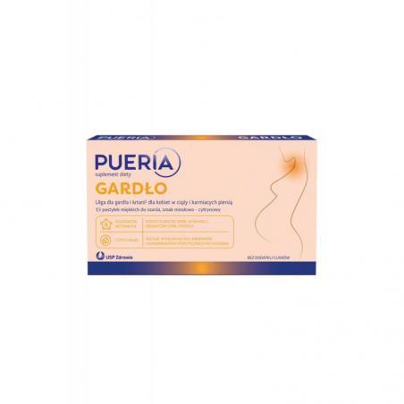 Pueria Gardło - to suplement diety w postaci pastylek miękkich, który zawiera w swoim składzie ekstrakty z plechy porostu islandzkiego, propolisu, kłącza imbiru, witaminę C i cynk. Produkt przeznaczony dla kobiet w ciąży i karmiących piersią.