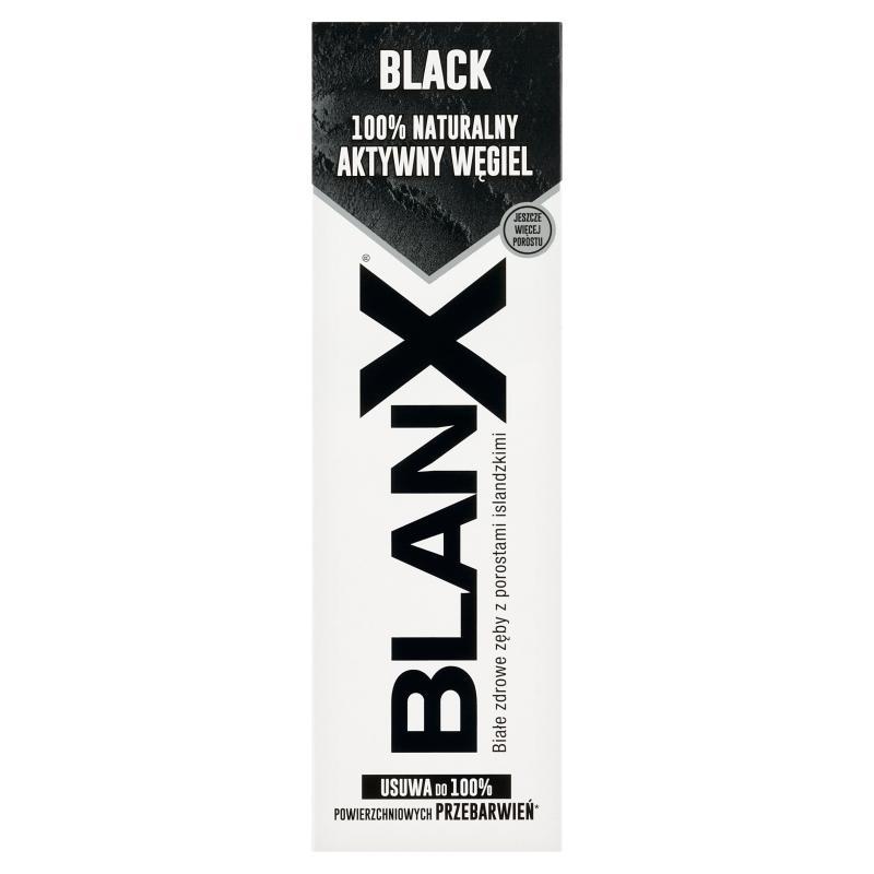 BlanX Black to kosmetyk w postaci pasty do zębów, przeznaczony wyłącznie dla dorosłych. Jej formuła z aktywnym węglem z drzewa kokosowego i wyciągiem z porostu arktycznego pomaga w usuwaniu przebarwień oraz w naturalny sposób wybiela zęby.