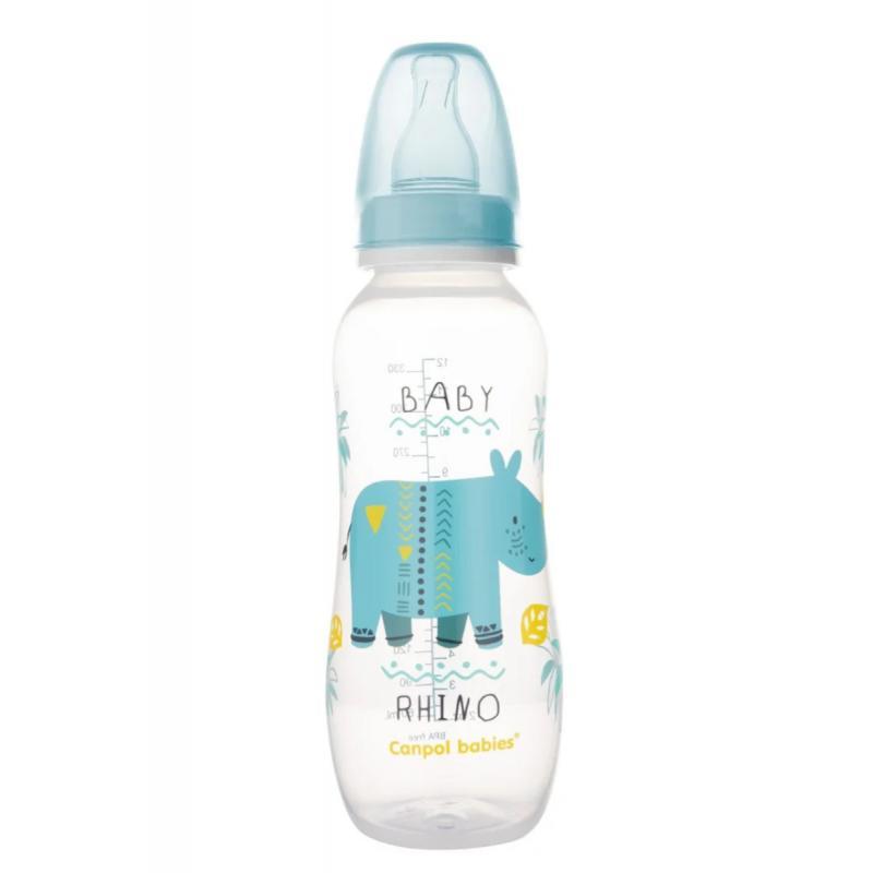 Butelka wąska Canpol babies 330 ml AFRICA umożliwia łatwe łączenie karmienia piersią i butelką. Wykonana jest z całkowicie bezpiecznego i bardzo wytrzymałego tworzywa — polipropylenu. Dzięki zastosowaniu tego materiału butelka wąska Canpol babies 330 ml AFRICA jest bardzo lekka, a jednocześnie przezroczysta. Umieszczona na niej doskonale widoczna, precyzyjna skala pozwala na dokładne odmierzenie ilości pokarmu podawanego dziecku. Butelka Canpol wąska 330 ml AFRICA została wyposażona w okrągły smoczek silikonowy o przepływie odpowiednim dla dzieci w wieku od 12 miesiąca życia. Ma pojemność 330 ml i polecana jest dla dzieci, które skończyły już roczek. Canpol butelka wąska 330 ml AFRICA wyróżnia się ergonomicznym kształtem, który gwarantuje komfort karmienia. Ponieważ butelka wykonana jest z tworzywa, które się nie potłucze, można bez obawy pozwolić maluchowi trzymać ją w rączkach. Obrazek, którym jest ozdobiona, dodatkowo zachęci dziecko do picia z butelki. Butelka Canpol wąska 330 ml AFRICA jest kompatybilna ze wszystkimi laktatorami Canpol babies. Można odciągania pokarmu bezpośrednio do butelki bardzo ułatwia codzienność. W zestawie znajduje się szczelny kapsel zapobiegający wylaniu się zawartości podczas transportu i pozwalający przekształcić butelkę w praktyczny pojemnik do przechowywania odciągniętego mleka mamy. Canpol butelka wąska 330 ml AFRICA dostępna jest w trzech wersjach kolorystycznych: żółta z tygryskiem, różowa z żyrafą lub turkusowa z nosorożcem.