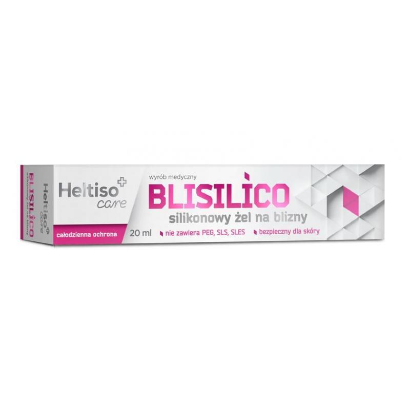 Heltiso care BLISILICO silikonowy żel na blizny to wyrób medyczny stosowany wspomagająco przy leczeniu blizn różnego pochodzenia. Może być stosowany po urazach, otarciach, skaleczeniach operacjach czy cięciu cesarskim. Żel powinien być stosowany po całkowitym wyleczeniu rany. Wyrób ma działanie wygładzające i rozluźniające tkankę blizny, przez co zmiękcza i uelastycznia zmianę poprawiając jej wygląd.