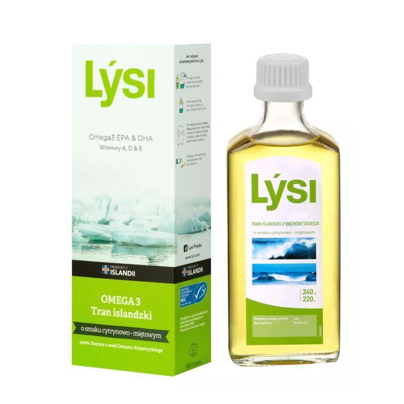 Lysi Tran islandzki o smaku cytrynowo-miętowym - to suplement diety z kwasami omega-3 oraz witaminami A, D i E. Tran islandzki Lysi jest naturalnym produktem pochodzącym ze zrównoważonych źródeł z wód Oceanu Atlantyckiego u wybrzeży Islandii. Tran Lysi posiada ważny certyfikat MSC. Produkt przeznaczony dla dzieci od 6. miesiąca życia i dorosłych.