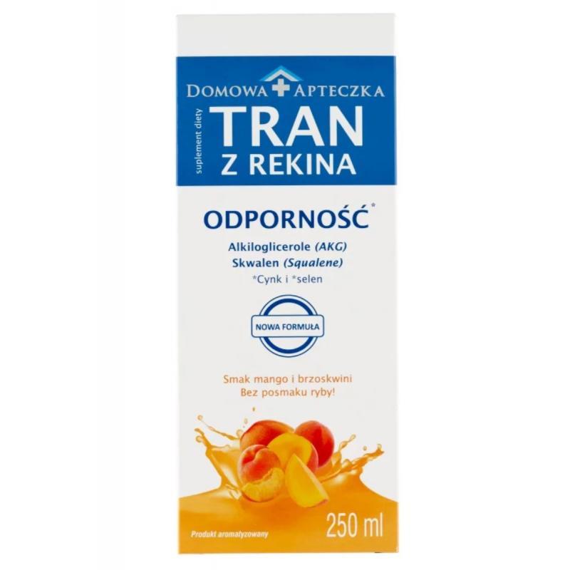 Tran z Rekina o smaku mango i brzoskwini Domowa Apteczka to suplement diety w płynie odpowiedni dla dzieci powyżej 3 roku życia i osób dorosłych. Zawiera certyfikowany olej z wątroby rekina, bogaty w alkilogilcerole i skwalen, oraz cynk i selen. Może pomóc w uzupełnianiu codziennej diety w cenne składniki aktywne w nim zawarte. Jest szczególnie polecany w okresie jesienno-zimowym.