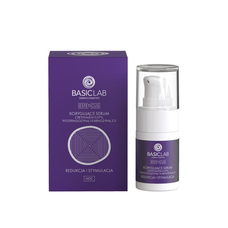 BasicLab Serum korygujące. Retinal 0,07% i fitosfingozyna redukują niedoskonałości i zmarszczki. Karnozyna 2.0 ujędrnia. Poczuj widoczne odmłodzenie cery.