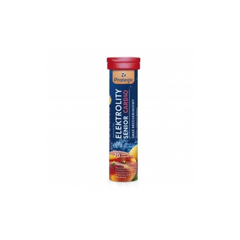 Protego Elektrolity Senior Cardio to suplement diety w formie tabletek musujących o smaku brzoskwiniowym, przeznaczony dla osób starszych. Zawiera kompozycję minerałów oraz witaminę C, a także ekstrakt z głogu dwuszyjkowego. Jego składniki wspierają prawidłowe funkcjonowanie układu sercowo-naczyniowego i nerwowego, a także pomagają w utrzymaniu równowagi elektrolitowej.