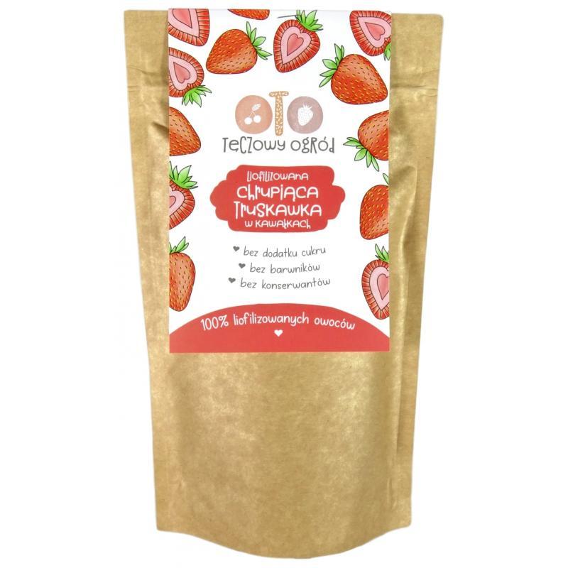 OtoLandia OTO Tęczowy Ogród Truskawka to pełnia smaku truskawek w chrupiącej formie. Doskonałą i zdrową przekąskę możesz chrupać jak chipsy pomiędzy posiłkami lub stosować jako owocowy dodatek do musli, jogurtu, owsianek, kasz lub innych ulubionych na słodko.
