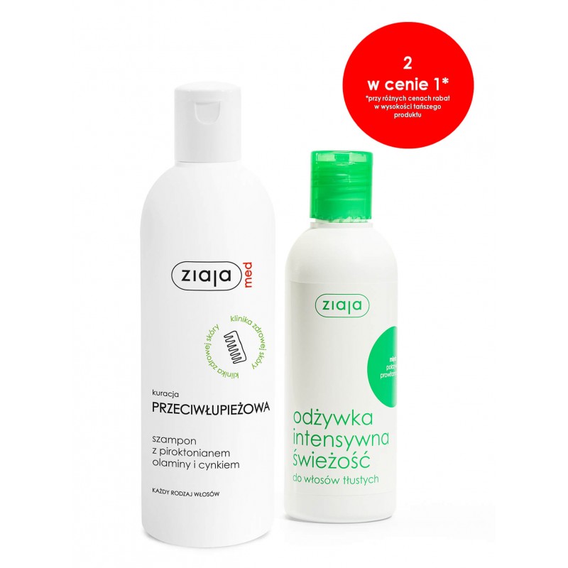 Ziaja Med Kuracja Przeciwłupieżowa Szampon + Odżywka gratis - zawiera Piroctonian olaminy i cynk, substancje o udowodnionej skuteczności przeciwłupieżowej.