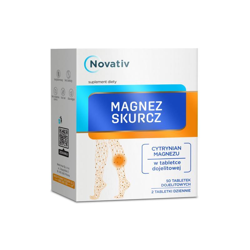 NOVATIV Magnez Skurcz to suplement diety, w skład którego wchodzą: magnez, potas, witamina B6, witamina D oraz witamina B12. Magnez przyczynia się do utrzymania prawidłowego metabolizmu energetycznego oraz utrzymania prawidłowej równowagi elektrolitowej. Potas i witamina D pomagają w prawidłowym funkcjonowaniu mięśni. Witamina B6 oraz witamina B12 przyczyniają się do zmniejszenia uczucia zmęczenia i znużenia.