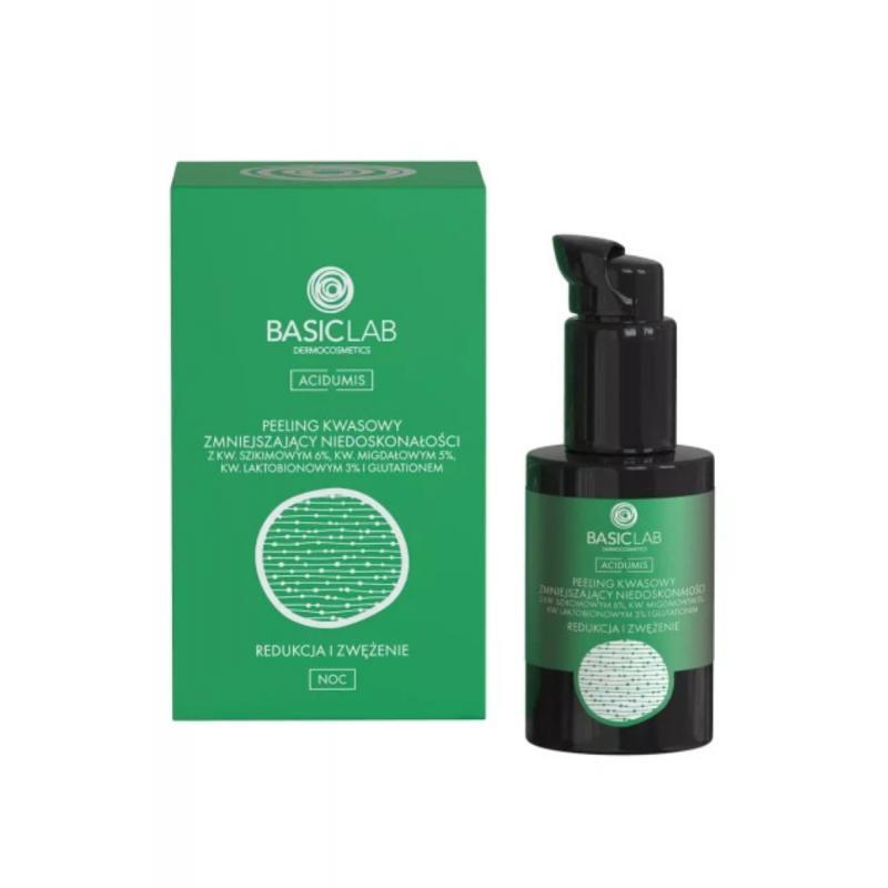BasicLab Peeling kwasowy. Kwas szikimowy i migdałowy to składniki, które oczyszczają pory i redukują niedoskonałości. Skóra staje się gładka i rozświetlona.