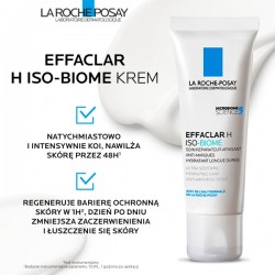 Effaclar H Iso-Biome to kojąca pielęgnacja nawilżająca, przeciw niedoskonałościom. Wskazania: skóra wrażliwa, skłonna do trądziku, uwrażliwiona wysuszającymi kuracjami przeciwtrądzikowymi. Twarz i okolice oczu. Innowacja. Aqua Posae Filiformis to unikalna prebiotyczna frakcja od La Roche-Posay, pozyskiwana z biomasy, znana jest z właściwości wzmacniających barierę ochronną skóry, aby wspierać prawidłową funkcję mikrobiomu. Zawarta w kojącej, nawilżającej i regenerującej formule z Niacynamidem, Panthenolem, Proceradem, Skwalanem oraz wyciągiem z ziaren Arnoty właściwej, o fizjologicznym pH. Potwierdzona skuteczność: Testowany na skórze tłustej, uwrażliwionej wysuszającymi kuracjami przeciwtrądzikowymi. Natychmiastowo i intensywnie koi i nawilża skórę przez 48h*. Dzień po dniu zmniejsza zaczerwienienia i łuszczenie się skóry. Widocznie zmniejszone niedoskonałości (-49%), zaskórniki (-16%)** oraz przebarwienia. Regeneruje barierę ochronną skóry w 1H***. *Test instrumentalny. **Badanie kliniczne na 43 osobach, aplikacja 2 razy dziennie, 2 tygodnie stosowania. ***Badanie instrumentalne parametru TEWL, 1H po aplikacji. Konsystencja. Nietłusta, nie klei się. Niekomedogenny. Bez alkoholu etylowego. Testowany pod kontrolą dermatologiczną w połączeniu z przesuszającą kuracją przeciwtrądzikową.