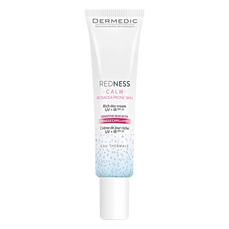 Dermedic Redness Calm Bogaty krem na dzień zalecany jest do pielęgnacji nadreaktywnej skóry naczyniowej, także w początkowych stadiach trądziku różowatego.