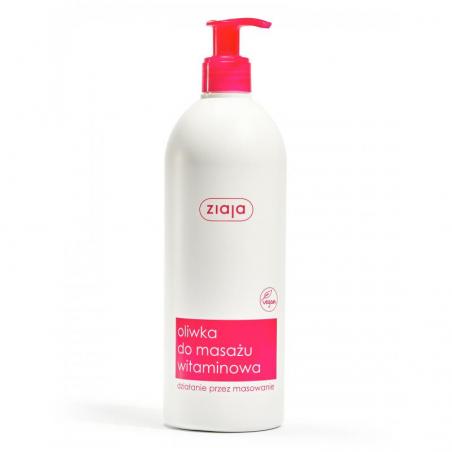 Ziaja Oliwka do masażu, witaminowa – nawilża, wygładza, ujędrnia i uelastycznia skórę. Działa odżywczo oraz łagodzi podrażnienia. Jest wydajna w użyciu, nie plami bielizny oraz posiada przyjemny kwiatowy zapach. Odpowiednia do codziennego stosowania, również w gabinetach kosmetycznych, fizykoterapeutycznych i w salonach SPA.