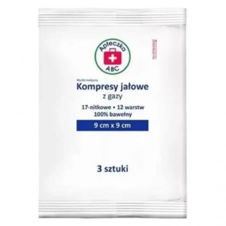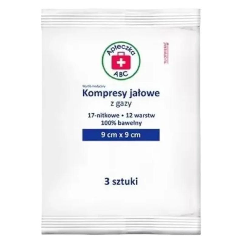 Apteczka ABC Kompresy jałowe z gazy 17-nitkowe, 12-warstwowe, 9 cm x 9 cm, 3 sztuki. Do wchłaniania wysięków. Wyrób jednorazowego użytku.