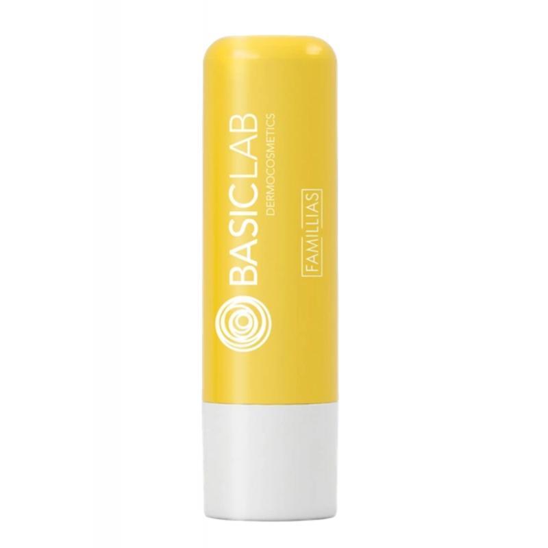 BasicLab Famillias Pomadka nawilżająca. Olej z rokitnika i wosk pszczeli to składniki, które nawilżają i regenerują. Usta stają się gładkie i miękkie.