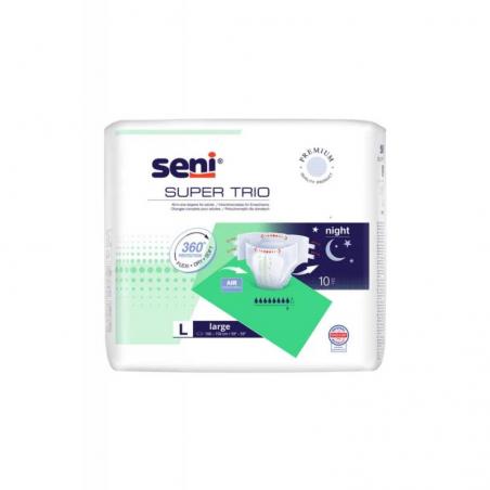 Super Seni Trio to dobre i sprawdzone zabezpieczenie przeznaczone zarówno dla osób aktywnych, jak i dla tych o ograniczonej mobilności. Wyrób przeznaczony jest dla osób z ciężkim oraz bardzo ciężkim stopniem nietrzymania moczu. Pieluchomajtki mogą być stosowane zarówno przy nietrzymaniu moczu, jak i przy inkontynencji kałowej.