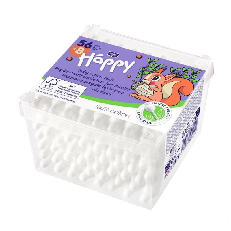 Bella Baby Happy papierowe patyczki higieniczne dla dzieci. Patyczki zostały obustronnie zakończone miękką i delikatną dla skóry dziecka bawełną. Specjalnie uformowany kształt końcówki z ogranicznikiem zapewnia bezpieczną dla dziecka pielęgnację. Patyczek został wykonany z papieru, dzięki czemu jest przyjazny dla środowiska.