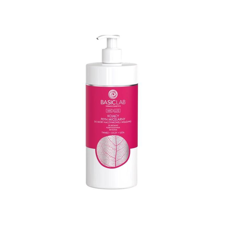 BasicLab Kojący płyn micelarny. Naryngenina i betaina to składniki, które łagodzą zaczerwienienia skóry naczynkowej. Usuwa makijaż bez pocierania.