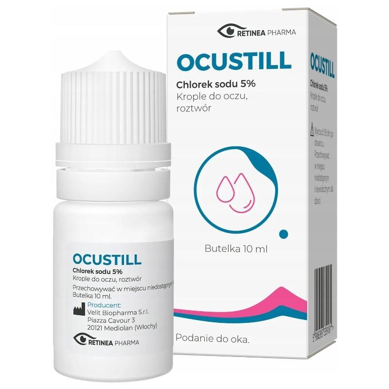 Krople do oczu Ocustill bez konserwantów. Zawarty w wyrobie chlorek sodu 5% działa na zasadzie osmozy, zmniejsza obrzęk rogówki i łagodzi dyskomfort.