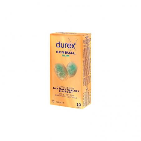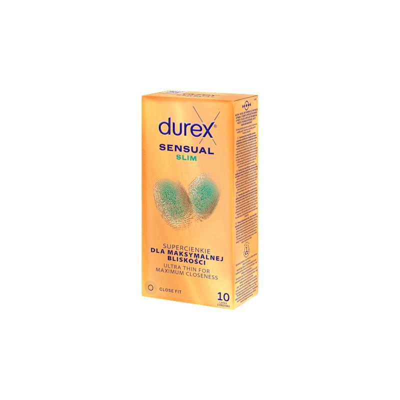 Durex Sensual Slim to lateksowe prezerwatywy zaprojektowane specjalnie by umożliwić użytkownikom najbardziej naturalne odczucia podczas zbliżenia przy zapewnieniu wysokiego bezpieczeństwa i ochrony. Zostały wykonane z supercienkiego materiału i pokryte silikonowym lubrykantem. Rozmiar Slim ma mniejszą średnicę w porównaniu do standardowych prezerwatyw Durex.