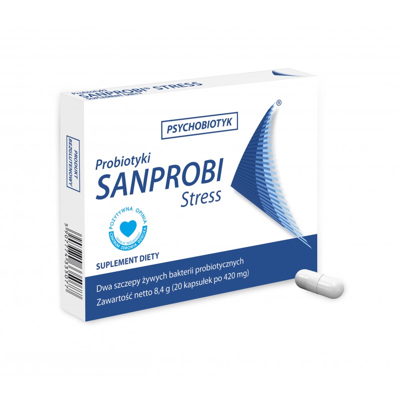 Sanprobi Stres - suplement diety zawierający kompozycję dwóch szczepów bakterii Lactobacillus helveticus Rosell oraz Bifidobacterium longum Rosel. Produkt przeznaczony dla osób dorosłych i dzieci powyżej 3 roku życia.