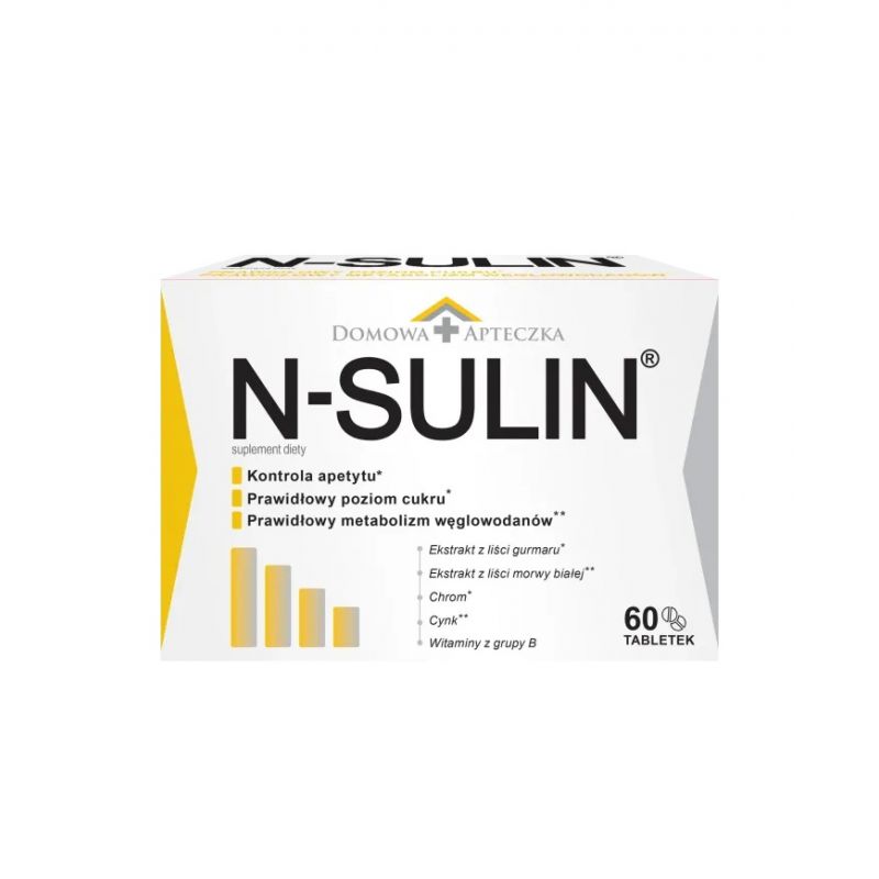 N-Sulin® to suplement diety w postaci tabletek zawierający 2 ekstrakty roślinne: z liści morwy białej i liści gurmaru standaryzowany na 25% kwasów gymnemowych oraz cynk, chrom i witaminy z grupy B: B6, B12 i kwas foliowy. Preparat może być stosowany jako uzupełnienie codziennej, dobrze zbilansowanej diety osób dorosłych.