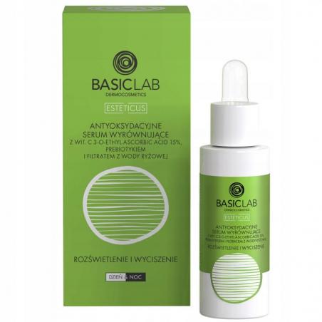 BasicLab Esteticus Antyoksydacyjne serum to preparat z 15% witaminą C, przeznaczony dla skóry trądzikowej, wrażliwej, z przebarwieniami i oznakami starzenia. Serum dodaje skórze blasku, poprawia jędrność i elastyczność, redukuje przebarwienia oraz zmniejsza produkcję sebum i zwęża pory, łagodząc stany zapalne towarzyszące trądzikowi.