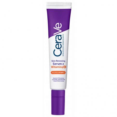 CeraVe Skin Renewing Serum z Witaminą C to formuła dla każdego typu skóry, która zawiera 10% czystej witaminy C, 3 kluczowe ceramidy i kwas hialuronowy. Serum rozświetla i wyrównuje koloryt, wzmacnia barierę ochronną, intensywnie nawilża oraz wspiera naturalne procesy odnowy skóry.