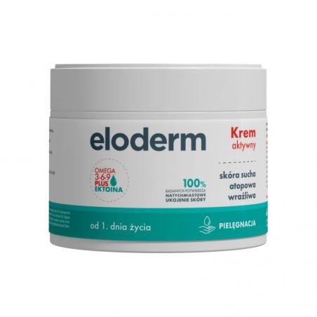Eloderm Krem aktywny to specjalistyczny kosmetyk dla dzieci (od 1. dnia życia) i dorosłych ze skórą suchą, atopową i swędzącą, który koi napięcie i podrażnienia oraz wspiera odbudowę bariery hydrolipidowej. Dzięki kompleksowi Omega 3-6-9 PLUS, Ektoinie i Prebiotykom, krem wzmacnia mikrobiom, długotrwale nawilża (Hydromanil™) i redukuje objawy dyskomfortu.