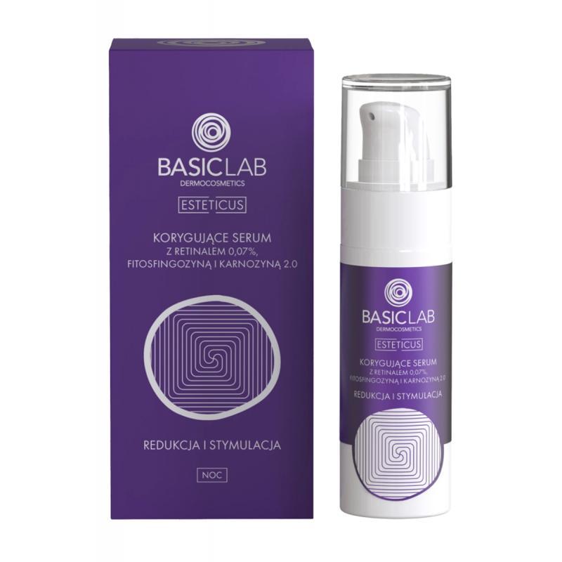 BasicLab Serum z retinalem 0,07%. Retinal spłyca zmarszczki. Fitosfingozyna łagodzi podrażnienia. Karnozyna poprawia napięcie. Skóra widocznie odmłodzona.