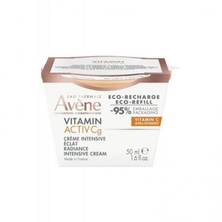 Opakowanie uzupełniające kremu Avene Vitamin Activ Cg. Zawarta w nim witamina Cg i niacynamid rozświetlają oraz wyrównują koloryt. Składniki korygują zmarszczki.