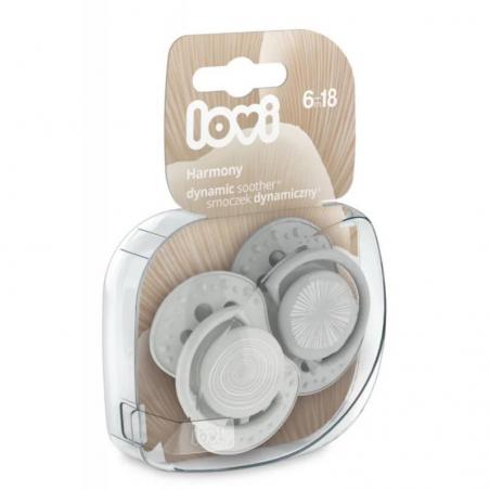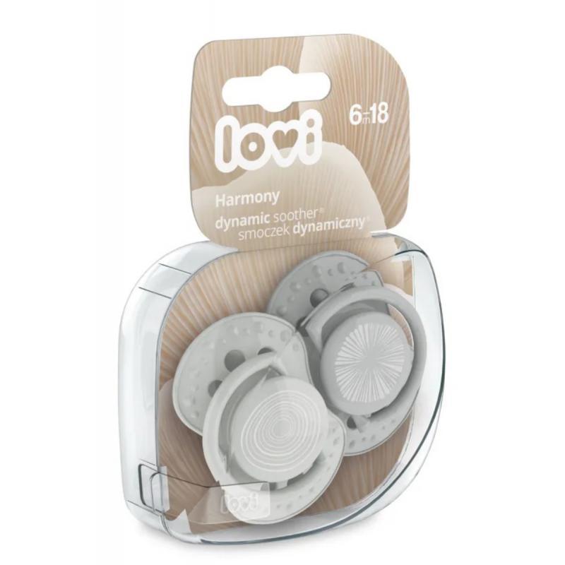Lovi Harmony to dynamiczny smoczek silikonowy w odcieniach szarości, przeznaczony dla dzieci od 6 do 18 miesiąca życia. Smoczek wspiera swobodne oddychanie i połykanie, a jego budowa nie zaburza naturalnego odruchu ssania. Zestaw zawiera dwa smoczki oraz akcesoria do ich higienicznego przechowywania.
