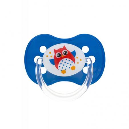 Smoczek uspokajający silikonowy symetryczny, Sówki, Canpol Babies, wykonany został z najwyższej jakości, bezzapachowego i bezsmakowego silikonu. Wyposażony został w gumkę o symetrycznym kształcie. Zapewnia swobodne oddychanie i połykanie śliny. Smoczek łatwo się odpowietrza się, dzięki zamieszczonym otworom wentylacyjnym na tarczce. Posiada świecącą wyprofilowaną tarczkę, która jest łatwa do znalezienia w ciemności. Nie zawiera BPA. Nie można używać w sterylizatorze parowym, zmywarce i mikrofali.