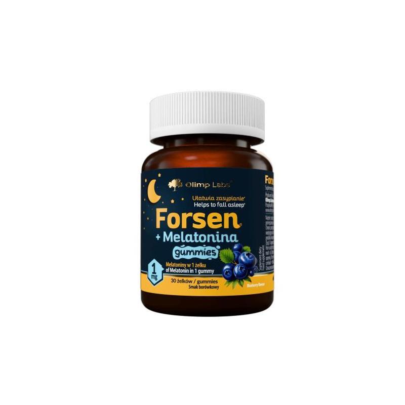 Olimp Forsen + Melatonina 1 mg to suplement diety w formie żelek o smaku borówkowym dla dorosłych, zawierający melatoninę oraz ekstrakty z różeńca górskiego, melisy i chmielu. Składniki produktu pomagają w skróceniu czasu potrzebnego na zaśnięcie i wspierają prawidłowe funkcjonowanie układu nerwowego, przyczyniając się do zmniejszenia uczucia zmęczenia i znużenia.