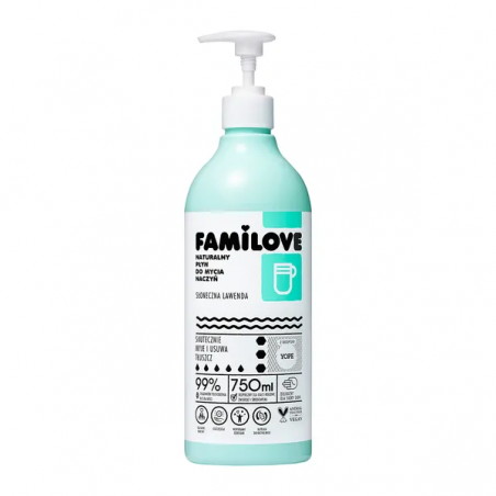 Yope Familove, naturalny płyn do naczyń, 750 ml – skutecznie usuwa tłuszcz i inne zabrudzenia, naczynia są czyste i lśniące. Dzięki neutralnemu pH nie podrażnia skóry dłoni i sprawia, że są miękkie i gładkie. Naturalna formuła biodegradowalne składniki gwarantują, że stosowanie płynu jest bezpieczne dla wszystkich domowników. Posiada przyjemną konsystencję i świeży zapach lawendy. Zawiera 99% składników pochodzenia naturalnego oraz o niskim stopniu przetworzenia.