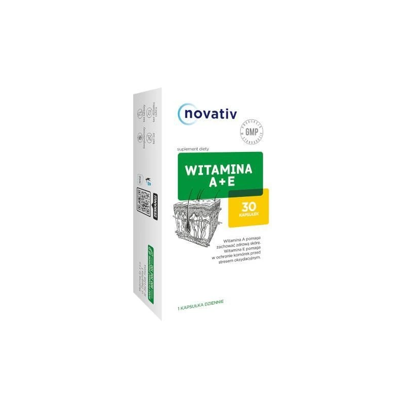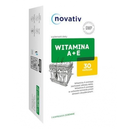 Novativ Witamina A+E to suplement diety, który zawiera witaminę A i witaminę E. Witamina A pomaga zachować zdrową skórę oraz błony śluzowe w prawidłowym stanie. Dodatkowo witamina A pomaga w funkcjonowaniu układu odpornościowego oraz przyczynia się do utrzymania prawidłowego widzenia i metabolizmu żelaza. Witamina E pomaga w ochronie komórek przed stresem oksydacyjnym.