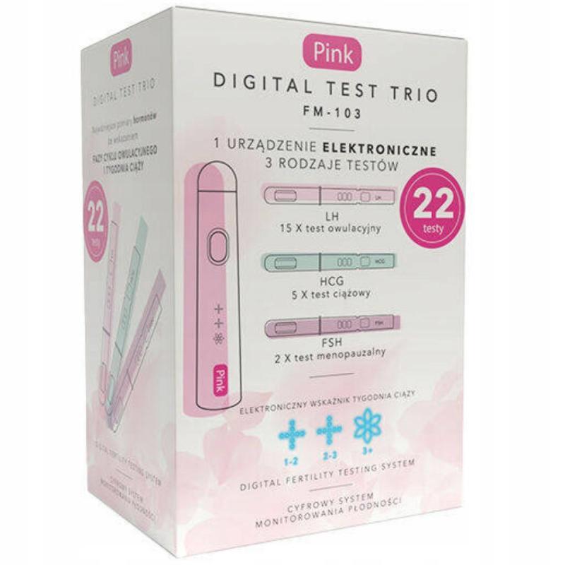 PINK Digital Test Trio: cyfrowy system monitorowania LH, HCG i FSH. Wskazuje fazę cyklu, tydzień ciąży i normę FSH. Wysoka skuteczność i czytelny wynik.