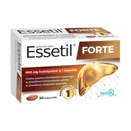 Essetil Forte kapsułki to przeznaczony dla osób dorosłych suplement diety, który zawiera fosfolipidy z nasion soi, standaryzowane za zawartość choliny.