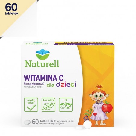 Naturell Witamina C dla Dzieci to suplement diety w formie tabletek do żucia i rozgryzania o smaku czarnego bzu i jabłka, który jest odpowiedni do stosowania powyżej 3 roku życia. Dzięki przyjemnemu smakowi i atrakcyjnej postaci do żucia preparat jest łatwiejszy do przyjmowania również dla wybrednych maluchów.