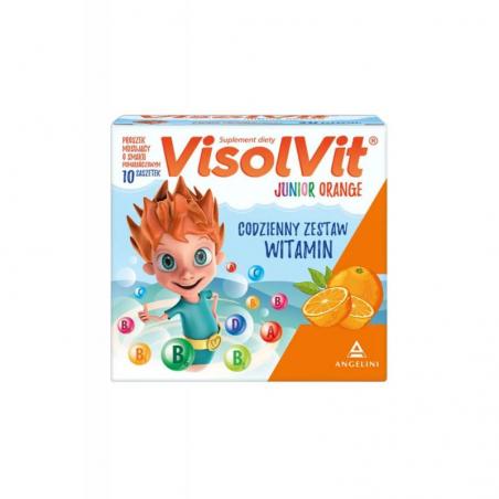 Visolvit Junior Orange to suplement diety w postaci granulek o smaku pomarańczowym, przeznaczony dla dzieci powyżej 3. roku życia i młodzieży. Zawarty w nim zestaw witamin wspiera prawidłowe funkcjonowanie organizmu, w tym odporność.