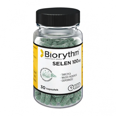 Biorythm, Selen 100 mcg – suplement diety w postaci kapsułek. Produkt przeznaczony dla osób dorosłych. Bez glutenu, laktozy, GMO, sztucznych barwników. Odpowiedni dla wegetarian i wegan.