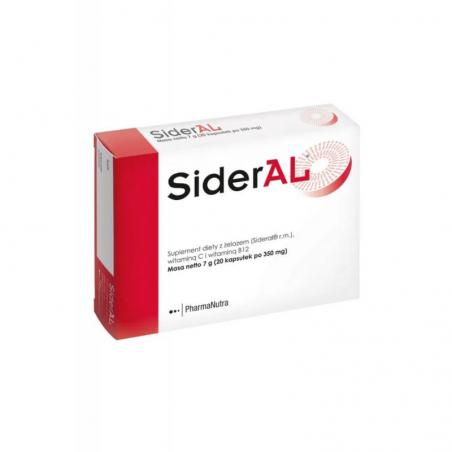 SiderAL to suplement diety w postaci kapsułek przeznaczony dla osób, które chcą uzupełnić swoją codzienną dietę w żelazo, witaminę C oraz witaminę B12. Produkt zawiera Żelazo Sideral®, które w niezmienionej formie przedostaje się do żołądka, a następnie ulega wchłonięciu w jelicie, dzięki czemu nie wywołuje niekorzystnego działania na funkcjonowanie układu pokarmowego.