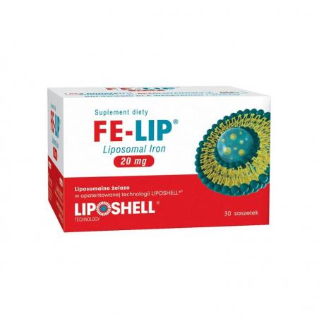 FE-LIP Liposomal Iron - suplement diety zawierający żelazo w formie w opatentowanej technologii LIPOSHELL. Produkt przeznaczony dla osób dorosłych ze zwiększonym zapotrzebowaniem na ten pierwiastek m.in.; kobiety ciężarne, kobiety w trakcie menstruacji, dawcy krwi, weganie i wegetarianie.