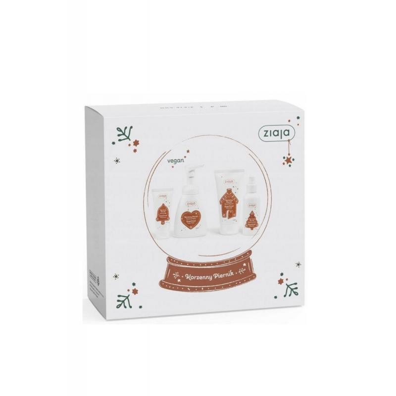 Zestaw Ziaja Korzenny Piernik: wegańskie kosmetyki o słodkim, świątecznym aromacie. Nawilżają, łagodzą i chronią skórę w zimowe dni. Zawiera 4 produkty.