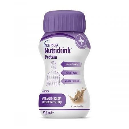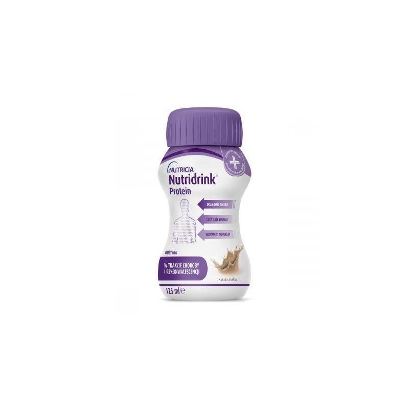Nutridrink Protein 125 ml to skoncentrowane źródło białka, kalorii i składników odżywczych w małej objętości. Jedna butelka Nutridrink Protein to 300 kcal, 18 g białka oraz pełen skład witamin i minerałów. Dostarcza dużo energii i wszystkie składniki odżywcze niezbędne chorej osobie, która ma problem ze spożywaniem wyłącznie tradycyjnych posiłków. Dostarczenie do organizmu białka jest szczególnie ważne w przypadku chorób onkologicznych. Jest to bardzo ważny składnik niezbędny w trakcie terapii i rekonwalescencji.